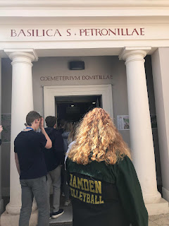 Our tour guide today was Maria Teresa And she was feisty! She told us a lot of facts about Rome like it was established in the 14th century (April 21st 753 BC) according to the legend of Romulus and Remus. Roma spelled backwards is amor, which of course explains why we love it so much! She also told us there 4 basilicas in Rome. Basilica comes from the word basil, which is the plant of the king. Today we were lucky enough to see St. Paul’s and St. Peter’s. Everyone was buried outside the walls of the city because they were not allowed to bury there dead within the city. To save money, the dug underground catacombs. The initials for “Jesus Christ, son of God” in Ancient Greek (IXYOC) spell fish.